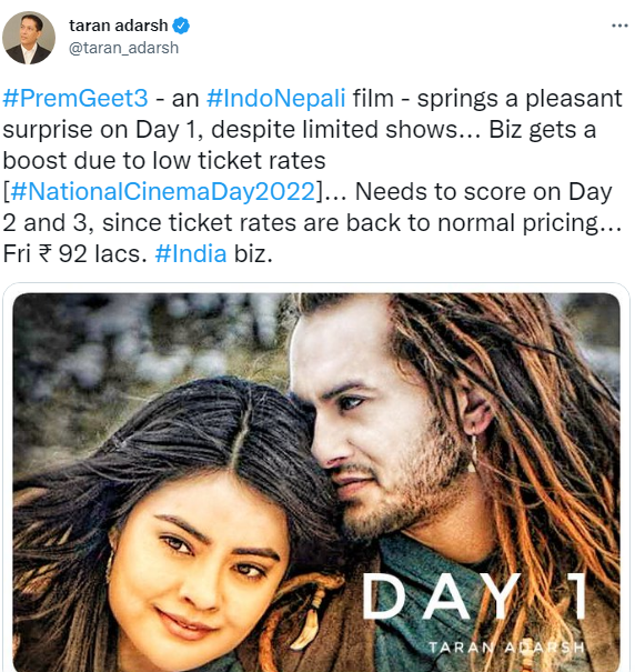 ‘सीमित शोका बाबजुद फिल्मले राम्रो व्यापार गरेको छ,’ उनले ट्विटरमा लेखेका छन्, ‘टिकटको दर कम भएका कारण फिल्मको कमाइ थोरै भएको हो। फिल्मको व्यापार २(३ दिनमा आफ्नो लयमा फर्किने छ।’