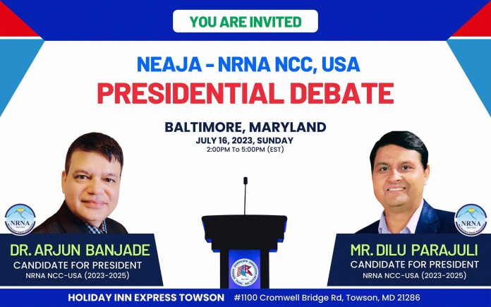 गैरआवासीय नेपाली संघ, राष्ट्रिय समन्वय परिषद्को निर्वाचन समितिले उम्मेद्वारहरूको अन्तिम नामावली सार्वजनिक गरेसँगै संघको आसन्न निर्वाचनमार्फत नेतृत्वका लागि प्रत्याशी बन्नुभएका डा.अर्जुन बञ्जाडे र डिलुकुमार पराजुलीसँग नेजाले मेरिल्यान्ड राज्यको बाल्टिमोर सहरमा नेजा-एनआरएनए प्रेसिडेन्सियल बहस कार्यक्रमको आयोजना गरेको हो ।