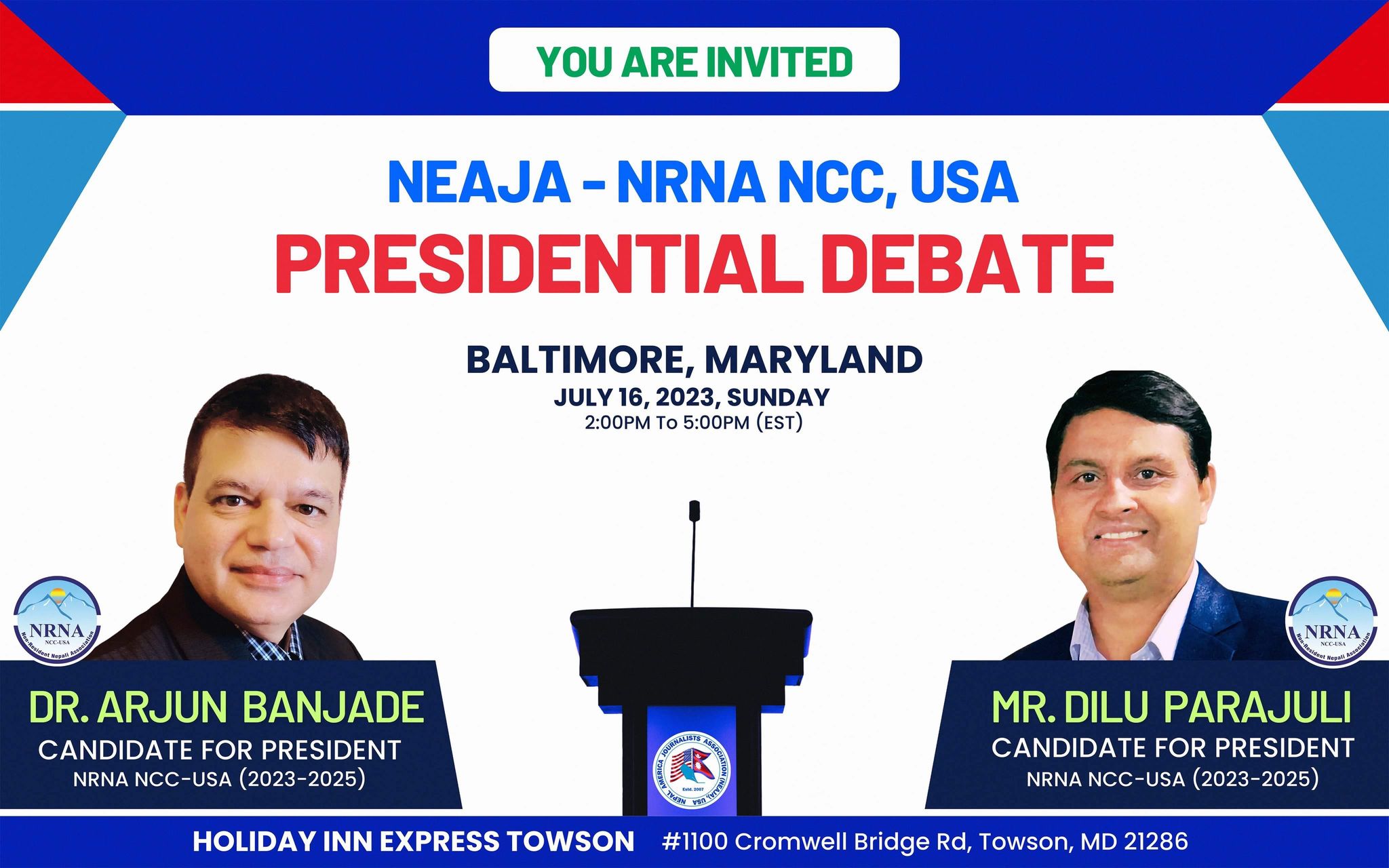 नेजा-एनआरएनए प्रेसिडेन्सियल बहस विगत केही वर्षदेखि हुँदै आएको छ । बहस कार्यक्रम बाल्टिमोरमा रहेको होलिडे इन एक्सप्रेसमा जुलाई १६, आइतबार अपराह्न २ देखि ५ बजेसम्म सञ्चालन हुनेछ ।